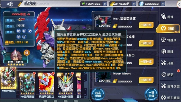 首先来看Moon Moon这一强化技能。MOON敢达暴击时,会对目标添加1层Moon Moon标记,当标记达到3层时,可以使敌方无法行动且持续较长时间。而当我方上阵5台主角型和浮游炮型机体时,MOON敢达每损失20%耐久就会为全队添加护盾,单独上场主角型或浮游炮型机体时又将产生不同效果。