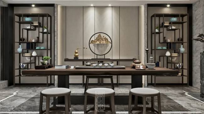 新中式风格讲究纲常,讲究对称,以阴阳平衡概念调和室内生态。选用天然的装饰材料,运用“金、木、水、火、土”五种元素的组合规律来营造禅宗式的理性和宁静环境。