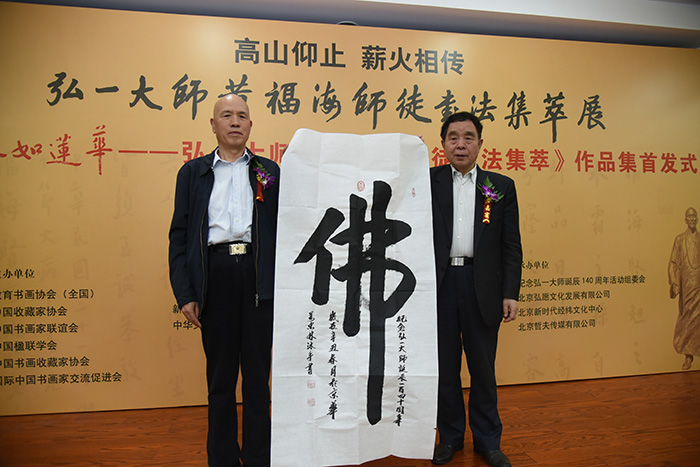 在活动现场,原国家新闻出版总署署长、十二届全国人大教科文卫委员会主任、纪念弘一大师诞辰一百四十周年组委会主任、《人如莲华——弘一大师黄福海师徒书法集萃》主编柳斌杰先生致开幕辞;原中共甘肃省委常委、宣传部部长、中国艺术研究院原院长、纪念弘一大师诞辰一百四十周年组委会艺术与学术顾问连辑,原国家宗教事务管理局副局长、纪念弘一大师诞辰一百四十周年组委会副主任蒋坚永,黄福海挚友、弘一大师与黄福海藏品主要传承人、原江苏省扬州师范学校高级讲师宋宏,中国书画收藏家协会会长崔陟,中国扶贫开发协会副会长、中国书画收藏家协会展览委员会会长、王府美术馆总监林福光先后致辞。江苏凤凰美术出版社副社长罗大明介绍了《人如莲华——弘一大师黄福海师徒书法集萃》新书出版情况。为祝贺展览的开幕,火箭军某部原副司令员万忠林将军向活动组委会赠送墨宝,柳斌杰署长代表活动组委会上台接受了作品。本次活动总策划、人民教育出版社原副社长、新华社原主任记者、新华书画院顾问、中国教育学会书法教育专业委员会原副理事长、纪念弘一大师诞辰一百四十周年系列活动组委会执行副主任尹鸿祝致谢辞。原国家物资部副部长、全国工商联原副主席兼秘书长桓玉珊宣布“弘一大师黄福海师徒书法集萃展”开幕。