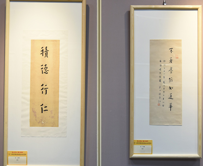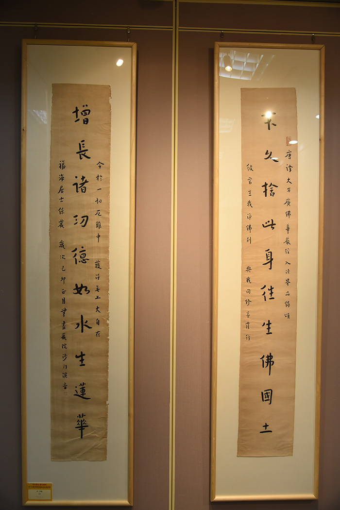 本次展览展出弘一大师法书79幅,其中弘一大师书赠黄福海先生的63幅;印光大师赠予弘一大师的手书遗墨,包括《大方广佛华严经入不思议解脱境界普贤行愿品》、《心经》与《修真捷径》批注册和手书经卷14卷本,印光大师与高鹤年居士合抄《妙法莲华经》10卷本;黄福海先生书法作品30幅。还展出纪念弘一大师诞辰一百四十周年系列活动组委会与编委会顾问、艺术与学术顾问、老领导、著名专家、学者、书画家胡振民、李乾元、桓玉珊、李晋有、覃志刚、韩亨林、武春河、赵学敏、何东君、徐锡澄、孙安民、连辑、王文杰、江杰生、郭尊先、沈建国、张锦、苏士澍、范迪安、孙晓云、尼玛泽仁、言恭达、赵铁信、李培隽、崔陟、舒乃仁、罗杨、孙克、邹德忠、林阳、李荣海、马书林、王仲、黎晶、彭利铭、王少跃、李涵、张铜彦、朱守道、解永全、李胜洪、刘俊京、梁永琳、丁谦、张杰、张坤山、宗家顺、肖良平、海国林、卿建中、刘建伟、李燕生、李学伟、陆天宁、曲平、曹玉文、程茂全、丁子同、徐健、吴子书、王振东、罗开富、董晨、尹向群、张程、丁荣华、蒋永义、吴澍、萧平、朱福烓、朱洪林、庄崇宏、照诚法师、能修法师、南山居士、任红雨、张寿溪、卢鸿杰、尹鸿祝、石愚,澳门及海外书画家霍志钊、丘程光、陆惟华、邱宏强、鲁吉光、侯杏妹的作品近一百幅。作品内容多为弘一大师格言、联语、警句等,以表达他们对弘一大师的敬仰和缅怀之情。《人如莲华——弘一大师黄福海师徒书法集萃》作品集收录了弘一大师法书79幅、黄福海先生作品40幅,其中弘一大师书赠给黄福海先生的法书62幅,幅幅堪称精品。同时展现了黄福海师从弘一大师各阶段学习“弘体”书法,以及培训青年人学习弘体书法和再创作的历程。纪念弘一大师诞辰一百四十周年系列活动组委会主任柳斌杰为此书撰写了序言。