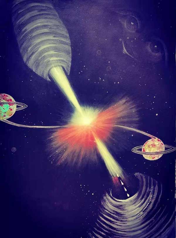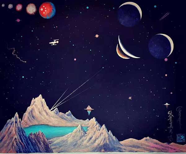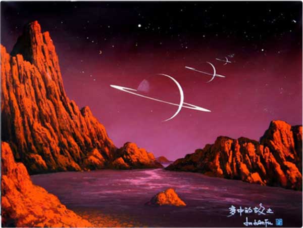 金力,原名金建福,是国际金奖画家,也是我国航天局聘请的绘画界的唯一”航天文化大使",被誉为泰斗级航天画派的大师,曾被清华教授评价为“用画笔书写科学论文的太空文明探索者”。