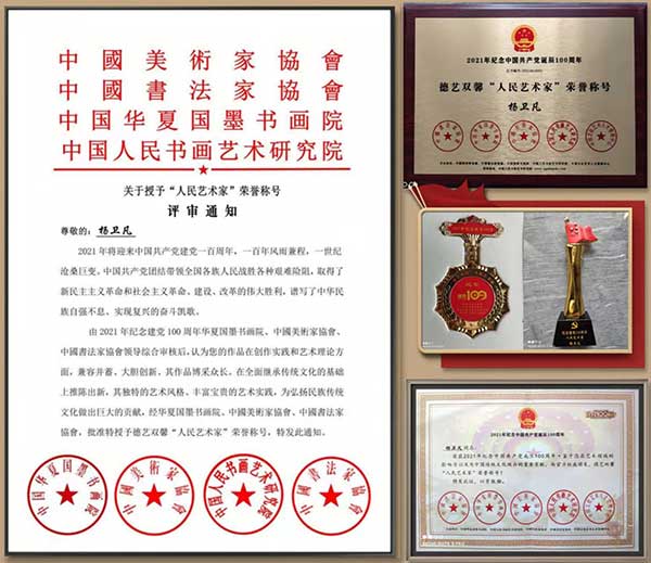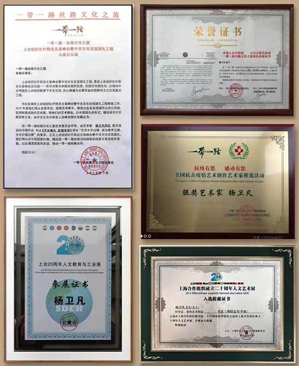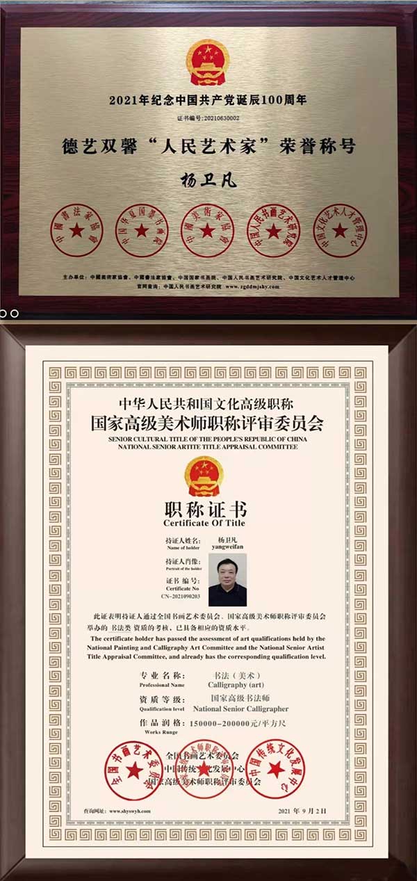 Yang Weifeng, born in 1956, is born in Lu'an, Anhui Province.Belt and road Cultural Tour National Rites Artist; National first-level artist; Director of the Chinese Calligraphers Association; Researcher of Huaxia National Art, Painting and Calligraphy Art Center; Member of the Presidium of the Calligraphers Association of Central State Organs; National senior calligrapher; (Hong Kong) Director of the Chinese Calligraphers Association; State guest artist of the People's Republic of China; The Art Talent Bank of the Art Talent Center of the Ministry of Culture of China (input); Member of the List Committee of the Chinese Art Association; Academician of China Century Grand Collection Calligraphy and Painting Academy; Director of Zhongsheng Shengshi International Calligraphy and Painting Academy; Academician of Beijing Huaxia Lanting Calligraphy and Painting Academy; Member of China Education TV CETV "Ink Painting" Calligraphy and Painting Academy; Doctoral Student Supervisor, Oxford College of the Arts, UK; Member of China International Calligraphy and Painting Artists Association; Member of the Australian Calligraphers Association; Beijing Huaxia Bang Jiao. Senior academician of Guoli Calligraphy and Painting Academy; member of China Couplet Calligraphy Association; reported by CCTV and overseas television stations, and his works are published in People's Daily, Military Daily, provincial daily newspapers and overseas newspapers.His works have been collected by many authoritative institutions such as national museums (embassies), and have been published for many times in national newspapers, magazines, books, postal books and other institutions at home and abroad.Works in the meeting (during) and the auction company many times auction transaction.